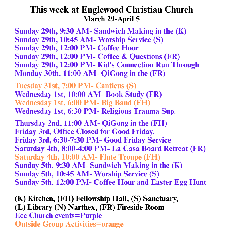 Sunday: 10:45 AM Weekly worship with an Easter egg hunt following the service in the back playground area. We will have coffee and doughnuts after service, but no potluck. Instead, our monthly potluck will happen on the following Sunday, 4/12.
