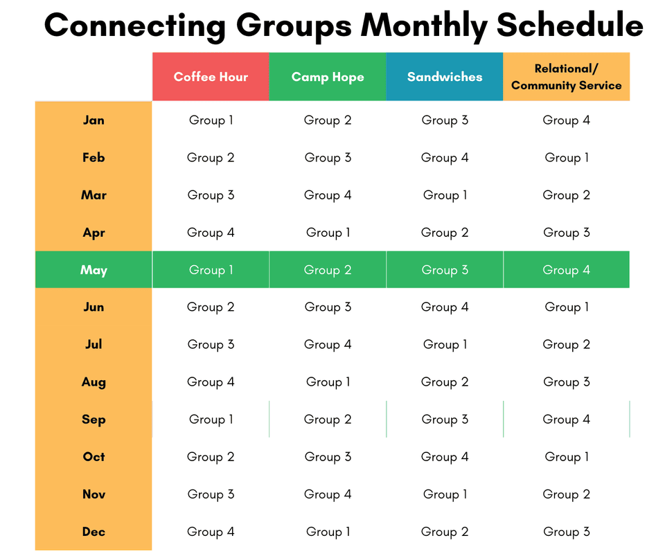 Those who are regularly involved in our faith community are placed in one of four connection groups. These groups rotate different roles each month as a way to meet needs and to build relationships with one another.